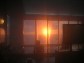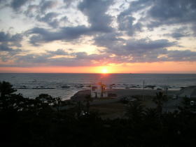 部屋からの眺めが素晴らしい。右の写真は翌朝6時半に部屋の窓から見た日の出です。 |