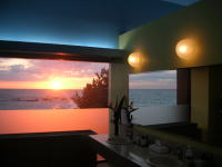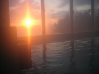 | 昇る朝日を眺めながらじっくり湯に浸かる・・・海辺の温泉ならではの爽快感です。(ただし、この写真は湯けむりで曇ったレンズと窓ガラスを通したために、予想外の効果がでています。実際にはここまでは朝焼けしていませんので悪しからず) |