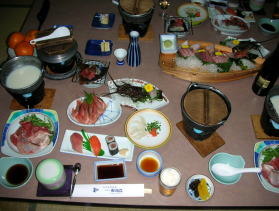 | 今回我々は部屋食を希望したため、一泊一人12,000円でしたが、食堂でのバイキングの場合は1万円以下で海の幸と温泉を満喫することができるとあって、日曜泊にもかかわらずほぼ満室状態、大盛況でした。 |