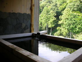 | 福水は周辺の景色に溶け込んだ、落ち着いた雰囲気の宿。浴槽は内湯と露天風呂が男女別に1つずつと家族風呂があります。 |
