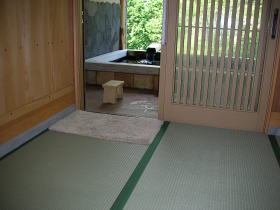 | 湯は沸かしで42℃に設定されているとのことですが、半露天なのでややぬるめに感じ、貸し切り状態だったこともあって、すばらしい景色を眺めながらすっかり長湯をしてしまいました。 |