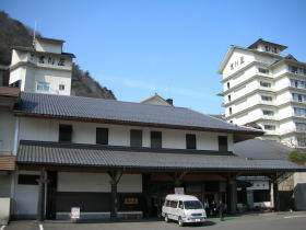| 吉川屋は穴原温泉の最奥に位置し、地上11階建て、客室数128の堂々たる外観。皇室御用達の宿だけあって、館内も豪華で少々気後れしますが、日帰り入浴も歓迎してくれます。玄関前には「女神の休足」と名付けられた足湯があり、無料で利用できます。 |