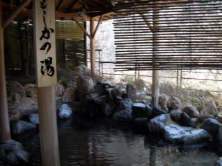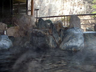 | 露天風呂「かもしかの湯」は吉川屋で唯一源泉かけ流しの浴槽です。あまり大きな湯舟ではありませんが、5〜6人はゆったり入れます。渓谷の断崖を眺めながら穴原の湯を満喫できます。湯は滑らかでとてもよく温まり、なかなか汗がひきませんでした。 |