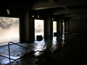 | 渓谷沿いに横長の大きな湯舟。檜風呂もあります。加水濾過循環式です。 |