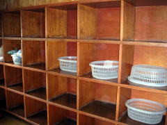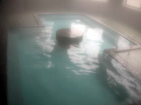 | 銭湯の番台のようなフロントで立ち寄り湯に来たことを告げると、女将さんらしき女性が「どちらからですか?」千葉からと答えると、「まあ、それは遠いところを」と驚いたふうで「どこか調子が悪いところあるんですか?」とこの地方独特の柔かいアクセントで尋ねてきました。どこも悪くないとも答えづらい雰囲気だったので「腰痛持ちなもので」と言うと(事実、何度もぎっくり腰をやっていて、その日もロングドライブで少々腰が重かったのです。本当を言うと「どこも悪くないと答えづらかった」のではなく、人間ドックであちこちボロを指摘されていてどれを答えてよいか迷ったというのが真実です)、「ここの温泉は腰にもとってもいいのよ。湯舟に浸かったらこうやって腰をゆ〜っくり回すの」と身振り手振りで教えてくれました。 |