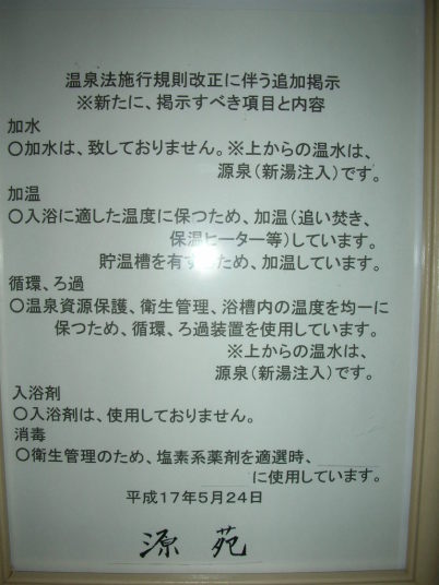 | 2004年の偽温泉問題の後、浴槽内での温泉の利用方法の掲示が義務づけられました。温泉情報の風通しがよくなり、今となっては白骨温泉に感謝したいと思います。 |