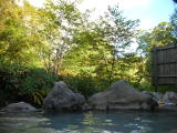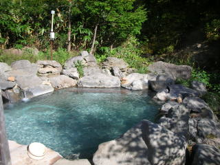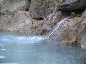 | おびただしい量の白い湯花が浮遊しています。湯は高温の2号源泉を使用しているのでしょうか。(利用客の)加水の加減で熱すぎたり、ぬる過ぎたりでやや安定しない湯加減でしたが、まさに自然の中の露天風呂で雰囲気抜群です。 |