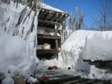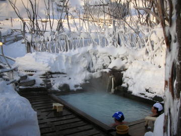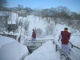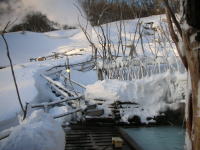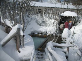 | 毎年この時期に訪れるという常連さんの話では、ここ数年雪の量がずいぶん少なくなっているそうです。以前は湯舟を囲む柵の上部まで雪が積もり、倒れてくるのではと、心配しながら浸かっていたとか。 |