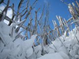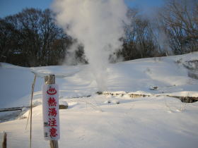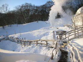 | 90℃近い蒸気が噴出している様子を眺めながら進みます。木道は凍っていて滑りやすいので注意が必要です。 |