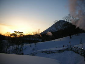右の写真のような静かな夜明けも見ることができるし、やはり宿泊してじっくり味わいたい野天風呂です。 |