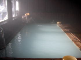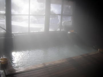新館(?)の2階にある大浴場。湯舟は男女別に1つずつあります。入口に日本秘湯を守る会の提灯がかかっています。