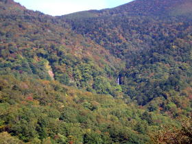 | バスは絶景ポイントに来ると道路脇で1分程停車してくれる。左の写真は幕滝を望むポイント。宿泊した幕川温泉もあの近くにある。右は湖見峠(うみみとうげ)。桧原湖や磐梯山、さらにその奥には猪苗代湖も見える。峠を命名したのは井上靖氏だとか。 |