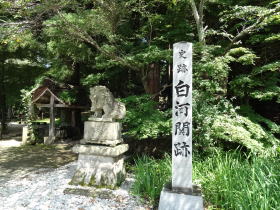 関所跡というと東海道の箱根関所跡や中山道の碓氷関所跡にある関所門を連想するが、白河神社の深々とした森の入口に建つ石碑があるのみである。