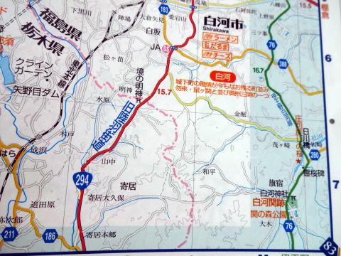 下調べで地図を見ると、白河の関は旧奥州街道(国道294号線)ではなく、県道76号線(伊王野白河線)にある。その道こそが律令時代に整備された官道、東山道(近畿から美濃→信濃→上野→下野→陸奥の各国府を結ぶ道路)だった。ちなみに奥州三関のあと2つは、近畿から太平洋沿いに設置された古代東海道の勿来の関(福島県いわき市)、日本海沿いを北上したの北陸道の鼠(念珠)ヶ関(山形県鶴岡市)だ。 |
