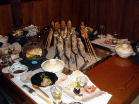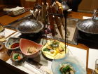 | 下は2013年3月に再訪した時の料理です。囲炉裏を囲んでの夕食は基本的に同じ。どれも美味しくて職場の仲間たちにも大好評でした。朝食は食堂での完全バイキングに変わっていました(写真右下)。 |