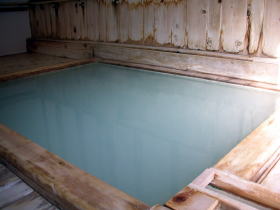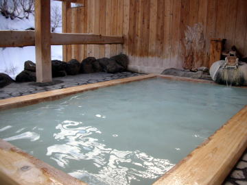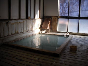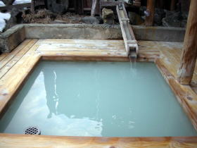 | 「月見風呂」は仙気の湯の片方の内湯の脱衣所に入口があります。湯舟は5、6人がゆったり入れる大きさです。お湯を口に含んでみると硫黄の臭いとともにかなりの酸味を感じます。 |
