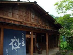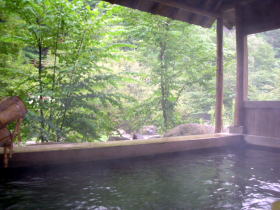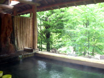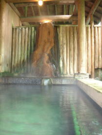 | 男性的な力強い湯舟という印象。泉源は湯小屋のすぐ近くで、もちろん源泉かけ流しです。すべすべした肌触りのいいお湯で、含有成分のため、湯舟の中は緑色になっています。 |