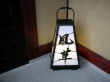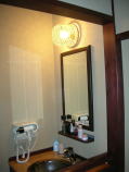 洗面台の照明にご注目。土産店でよく売っている竹編籠が被せられています。
