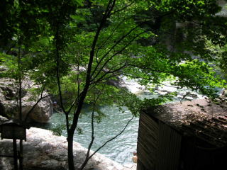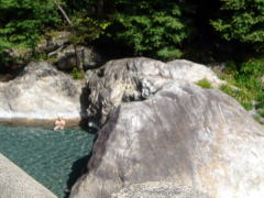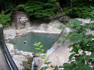 | 湯温は37℃と温めで、渓流の涼しい風も心地よく、いつまでも入っていられます。入っているうちに自分の体まで周囲の自然に溶け込んでしまったかのような錯覚に陥りました。 |