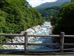 | 新穂高の湯は蒲田川に架かる旧中尾橋の下にあります。車は橋の手前に広めの駐車場に置きます。 |