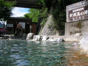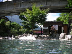 | 開放感抜群・・・ということは橋の上からの眺めもいいので、女性は入りづらいと思います。水着やバスタオルを用意した方がいいでしょう。「温泉に水着は邪道」が信条ではありますが、ここではそんなこだわりも忘れるくらい大らかな気持ちになります。 |