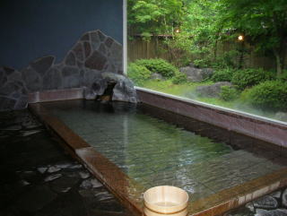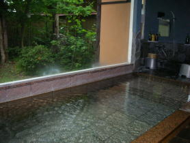 透き通った湯があふれるきれいな湯舟。大きくとられた窓から小庭園を眺めながらのんびり浸かれます。