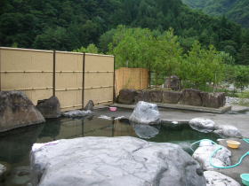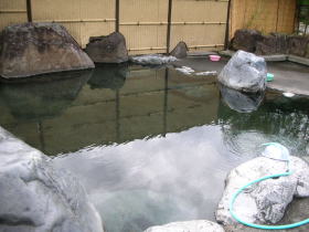 | この露天風呂はあまりにも開けっぴろげな感じがします。男女の露天風呂とも、脱衣所の脇を回り込むと、簡単に湯舟が覗けてしまうのです。現に湯舟に入っていたら、覗いていく(男性が男性浴場をですが)人がいました。もしかしたら盗難や覗きといった犯罪行為をさせやすい構造かもしれません。改造の余地ありです。 |