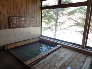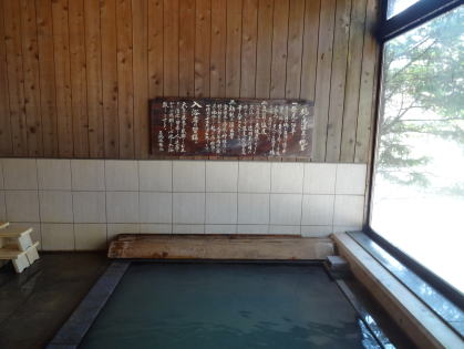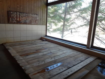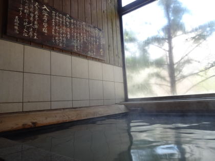 | 昆布茶色とでも表現したらいいのでしょうか。青緑っぽく笹濁りした湯は実にマイルドな肌触り。季節や天候によって白くなったり、黄色くなったり、様々な色になるそうです。源泉温度44℃ほどの湯を加水加温なしでかけ流していて、湯舟では40℃くらいでしょうか。じっくり長湯ができる湯温です。 |