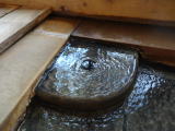 | 静かに湯が注がれる湯口からは時折思い出したかのようにガバガバと湯が溢れてきます。オーバーフローする湯は湯舟内の穴から下の写真のように排湯されるシステム。ふたをする都合上、考え出されたものでしょう。 |