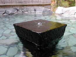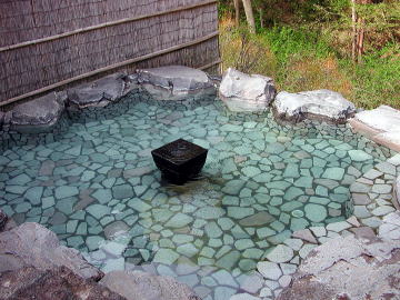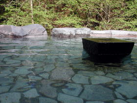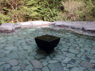 実はこの露天風呂は当HPのバナーのモデルになっているのです。開設一周年記念にネット友達がプレゼントしてくれたバナーで、季節は秋、女性風呂です(トップページとリンクページにあるので、よかったらご覧ください。黄色いバラの次に登場します)。一度は来なくてはと思っていたのですが、ようやく念願が叶いました。想像どおりの美しい風呂です。 |