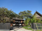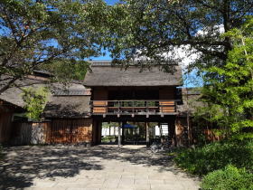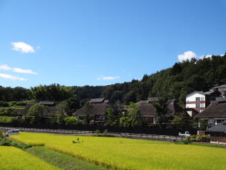 | のんびりと広がる田んぼ。山裾でそれを見守るように建つかやぶき屋根。まさに日本の原風景のような景色です。入口を入ると堂々たる長屋門が出迎えてくれます。 |
