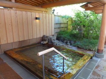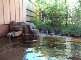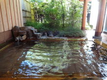 | こちらが露天風呂(加温・循環式)。悪くない、悪くないけれど一度源泉浴槽に入ってしまうとこちらはまあいいかという感じ。ちなみに循環といっても嫌な塩素臭は全くありませんでした。 |