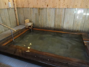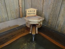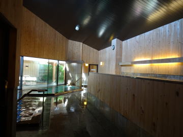 | 3つの湯舟のうちではやはり断然この源泉浴槽が良かったです。ほんのり硫黄香がするアルカリ性の湯はヌルスベとまではいかないまでもとても柔らかい肌触り。源泉温度が38.8℃と39.4℃という2本の自家源泉の混合泉ですから温くて長湯が出来ます。「出来ます」というより、いつまででも入っていたい極上の湯です。 |