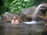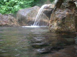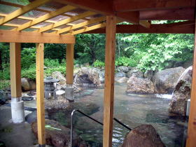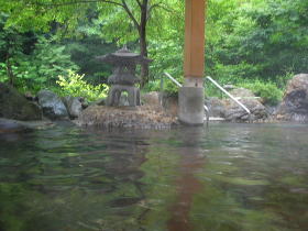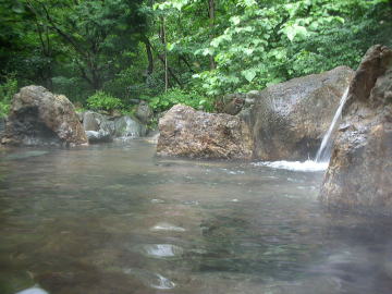 以前は旧源泉との混合でもっと温かったそうですが、今は若干泉温が高い新源泉のみを使用していて、夏場ということもあり程よい湯加減。もちろん源泉かけ流しです。 |