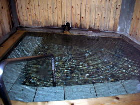 | こちらは旧源泉(もしくは新源泉との混合)なのでしょうか。湯舟の広さに合わせて湯量を絞っているせいもあるのでしょうが、温めに感じます。体が包み込まれるようなまろやかな肌触りで、肌もすべすべ・・・素晴らしい泉質です。 |