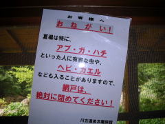 | 緑に包まれ、上質の湯に包まれ、いつまでも入っていたい〜と、長湯を決め込みたいところだったのですが、アブがすごい。湯舟の縁にアブたたきがあって防戦に大わらわ。奮闘むなしく一箇所刺されてしまいました。 |
