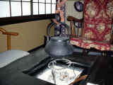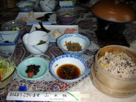 夕食の際におこわか白いご飯かを選びます。鍋の中は舞茸のバター焼き。美味しかったです。 |