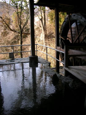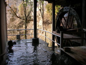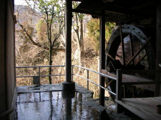 | 現役の水車がゆっくりと回る傍らで浸かる川原湯温泉は最高。眺めもよく、いつまでも入っていたい湯舟です。半露天なので雨でも大丈夫。 |