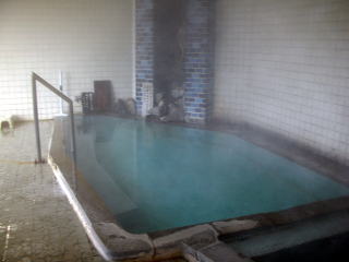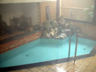 | 湯舟の傍らに坪庭があります。湯は熱く、朝に入ったときは加水しなければ入れない状態でしたが、シャキッとするいい湯でした。夜10時に「ムササビ覗きの湯」と男女入れ替えになります。 |