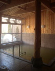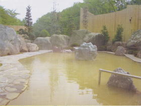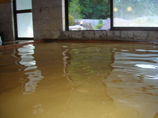| 内湯と露天風呂が男女別にあります。天井が高く、木をふんだんに使用したきれいな浴場です。湯の色から想像できるとおり鉄分と塩分の混ざったようなにおい。どんなに強烈な湯かと身構えて入ると、意外にもまろやか。スベスベしたいい肌触りです。かけ流しの湯はややぬるめで、長湯を楽しめます。 |