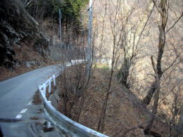 霧積ダムを過ぎたあたりで携帯電話の電波は途絶え、舗装はされているものの、時折設置されている待避所以外ではすれ違いもできない細い山道を登っていきます。 |
