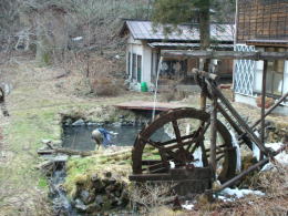 それでも水車を回すための樋から漏れた水が凍って氷柱になっています(上の写真)。