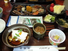 | これぞ正統派。清く正しい旅館の朝食という感じです。手前左の茶色い器に入っているのは温泉たまごです。 |