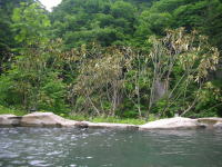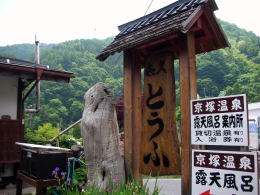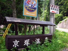 道の駅「六合」近くで国道292号線と分岐する国道405号線を野反湖に向かって進むと、入山地区の中心地、「喜久(きく)とうふ店」の看板の脇にお目当ての京塚温泉の標識があります。