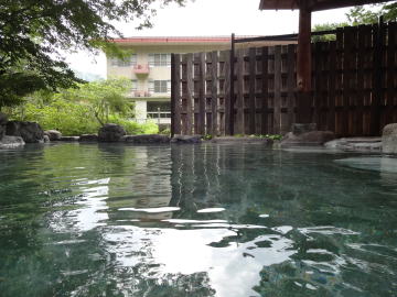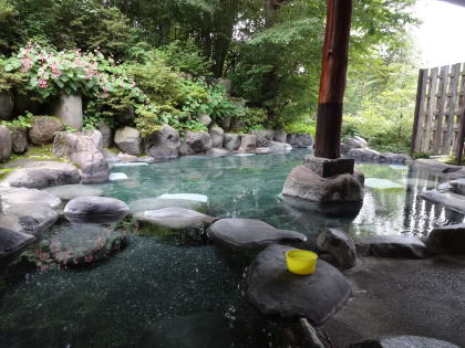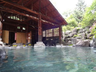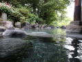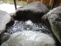 | 湯舟は石で3つに仕切られています。男女それぞれの脱衣所を出たところにあるのが、湯口に近い熱め(といっても40℃くらいでしょうか)、そこからオーバーフローした湯が満たす広い湯舟はかなり温めです。残暑厳しい9月上旬には気持ちよかったのですが、冬場は温すぎるのではないでしょうか。 |