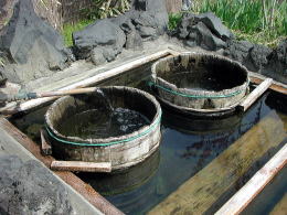 樽風呂なのか雰囲気作りのためなのか。一瞬入ろうかと思ったけれど、藻が付着していてヌルっとしたのでやめました。