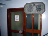 | 受付けを済ませて階段を下り、浴場のドアを開けると脱衣所(左の写真上部)があります。湯舟へはさらに階段を下りていきます。山の斜面に建てられた浴場のため、このように変則的な作りになっています。 |