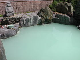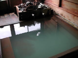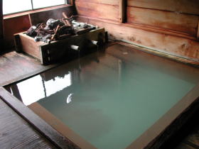 実は宿のご主人はお母様をガンで亡くされ、ガンを患った人たちを何とか救えないものかと考え出したのがこの「さるのこしかけ湯」だとお聞きしました。飲泉もでき、一日お猪口一杯くらいが適量だそうです。 胃腸・肝臓病、糖尿病にも効くそうで、一升瓶やポリタンクに注いで持ち帰る人も多いとか。是非お持ち帰りなさいと、女将さんがわざわざ空いた一升瓶を持ってきてくれました。 |