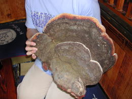 これがご主人が採ってこられたサルノコシカケ。サルノコシカケは広葉樹に生える多年生のキノコで、硬くてずしりと重い。一口にサルノコシカケと言っても50種類余りもあり、中でも松の木に生えたものが一番いいのだとか。