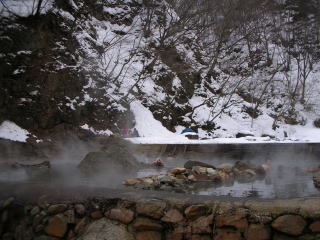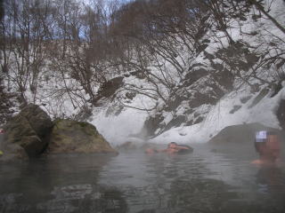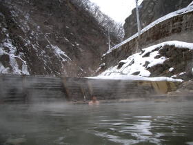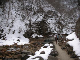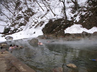 今回は冬ということで、宿泊なしの日帰り客がいたかどうかはわかりませんが、宿から来た人たちは浴衣やコートの下に水着を着用していたようで、我々おやじ5人を除いて、女性はもちろん、男性も皆水着姿でした。「温泉に水着は邪道」と心得る私ですが、脱衣所もないただの川原なのでやむを得ないことではあります。お出かけの際は水着を持って行った方がよいでしょう。 |